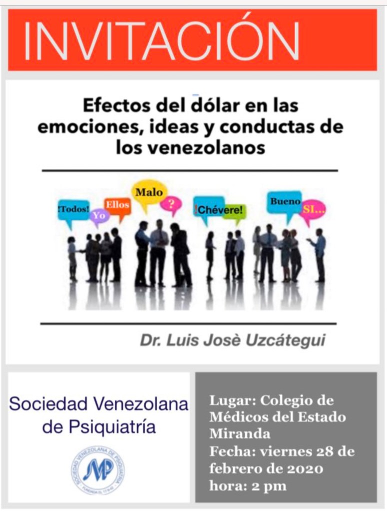 Muchas gracias a la junta directiva de la Sociedad Venezolana de Psiquiatria por la invitación a presentar la conferencia “Efectos del dólar en las emociones, ideas y conductas de los venezolanos”, a continuación una corta síntesis de la conferencia.