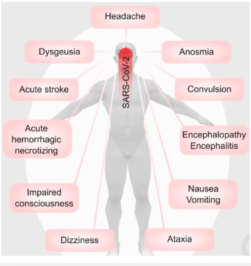 El coronavirus al entrar a través de los receptores de la enzima convertidora de angiotensina 2, el 2 SARS-CoV-2 puede dañar las células endoteliales y provocar inflamación, trombos y daño cerebral. Además, la inflamación sistémica conduce a la disminución de monoaminas y factores tróficos y la activación de la microglía, lo que resulta en un aumento de glutamato y N-metil-d-aspartato (NMDA) 3 y excitotoxicidad.