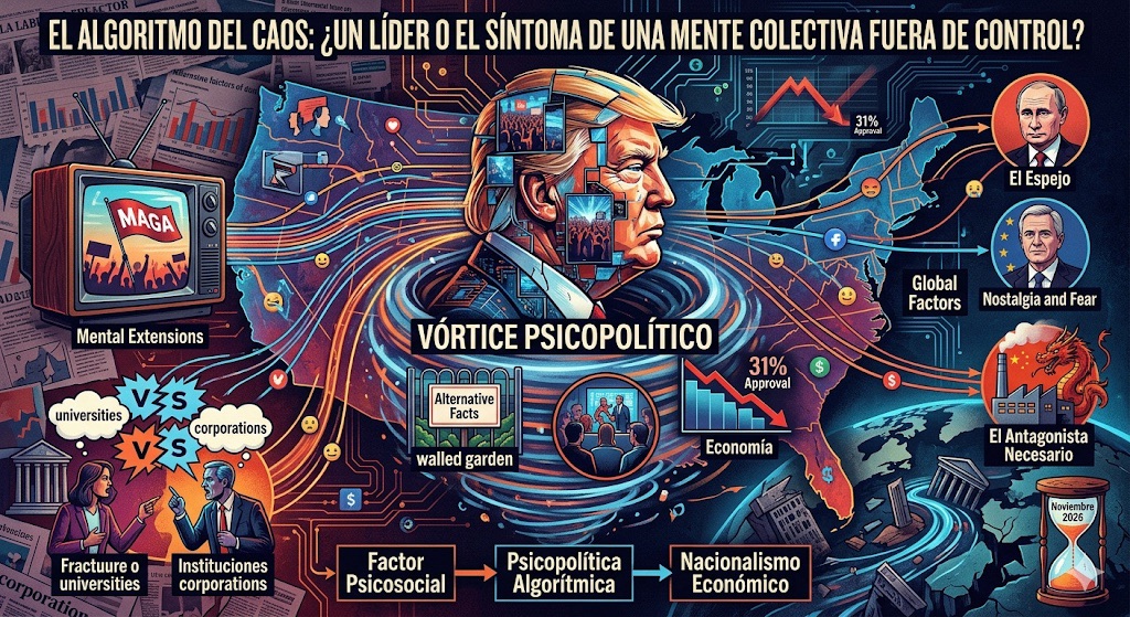 El escenario es crítico. Con una aprobación estancada en el 39% y una percepción económica bajo mínimos históricos (con un rechazo del 69%), la administración Trump no está retrocediendo ante los datos. Al contrario, su respuesta es la intensificación del caos. Desde la óptica de la «Mente Extendida», la conducta de Trump no es la de un individuo aislado, sino la de una interfaz que se ha fusionado con la infocracia y los algoritmos de las redes sociales para reescribir la realidad en tiempo real.