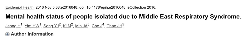 De 14,992 individuos aislados durante 2 semanas debido a tener contacto con pacientes con MERS en 2015, cuando MERS fue introducido en Corea, 1,692 individuos fueron incluidos en este estudio. Los síntomas de ansiedad se evaluaron con la escala de 7 ítems del trastorno de ansiedad generalizada y la ira se evaluó con el Inventario de expresión de ira de rasgo estatal a los cuatro o seis meses después de la liberación del aislamiento para MERS.
